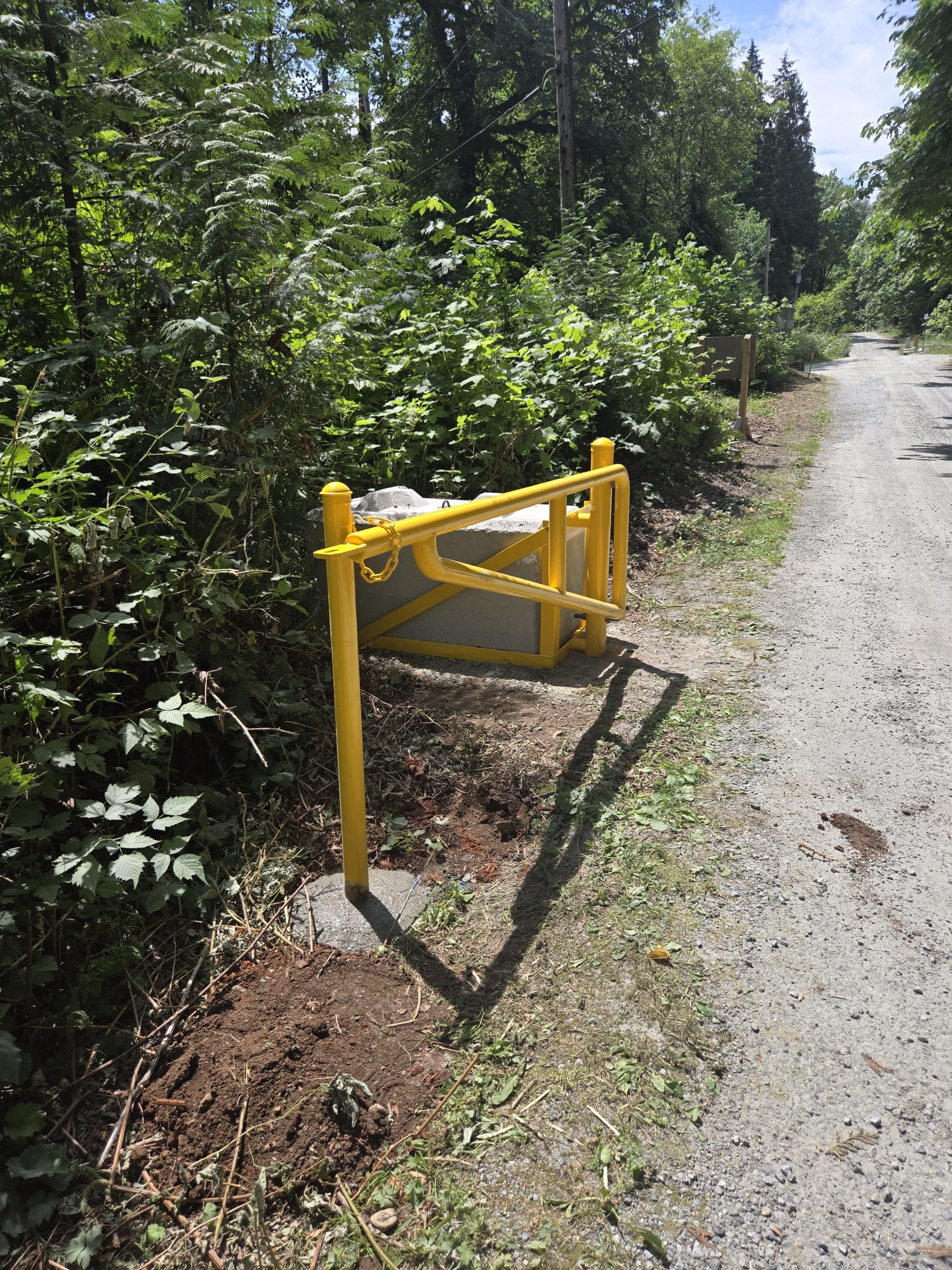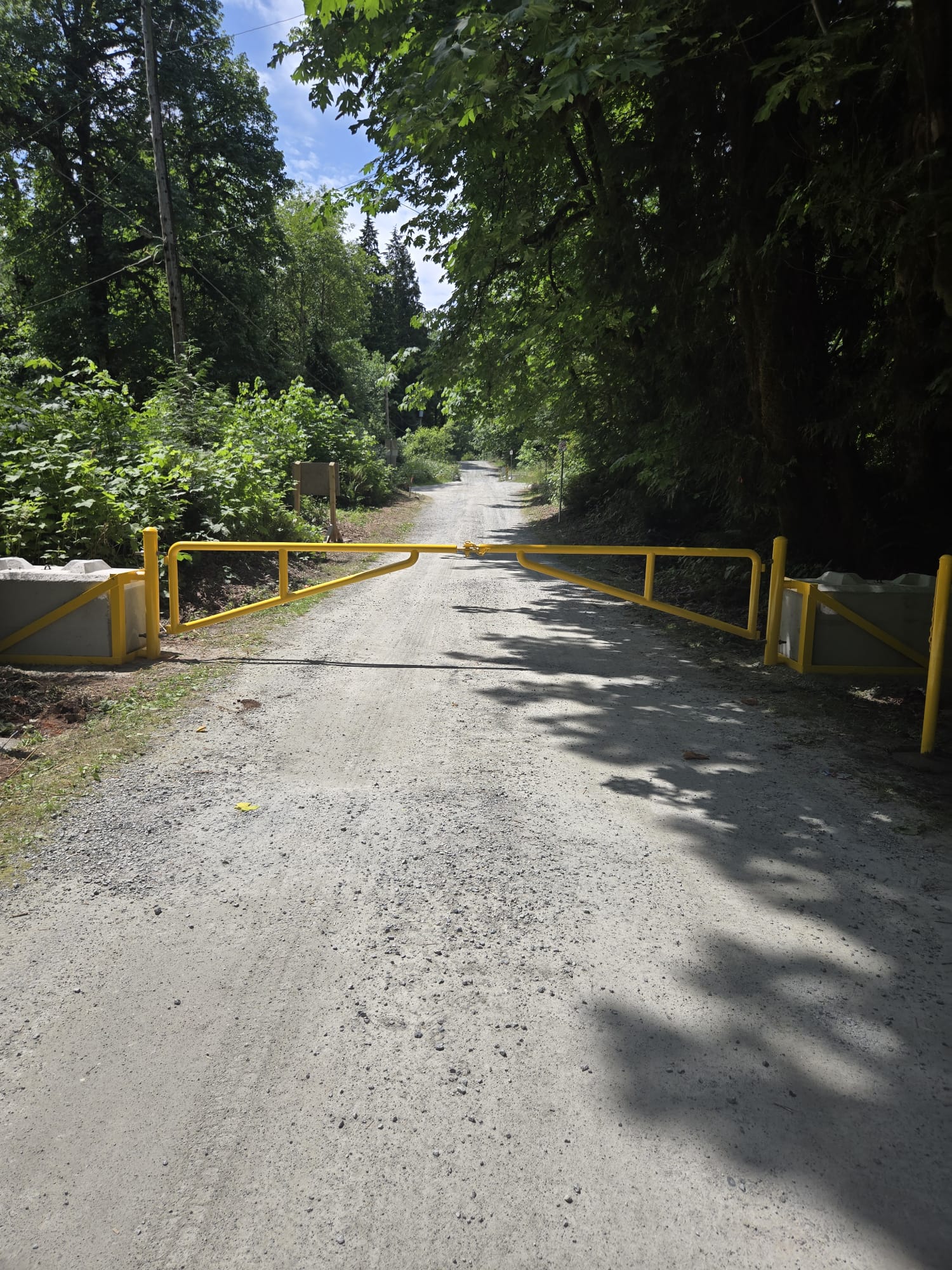 We installed this 6m-wide double vehicle barrier gate for Metro Vancouver. Everything was custom fabricated, including the brackets to fit the concrete foundations. As is the norm for barrier gates in the lower mainland, all materials were powder coated safety yellow and features reflective tape.