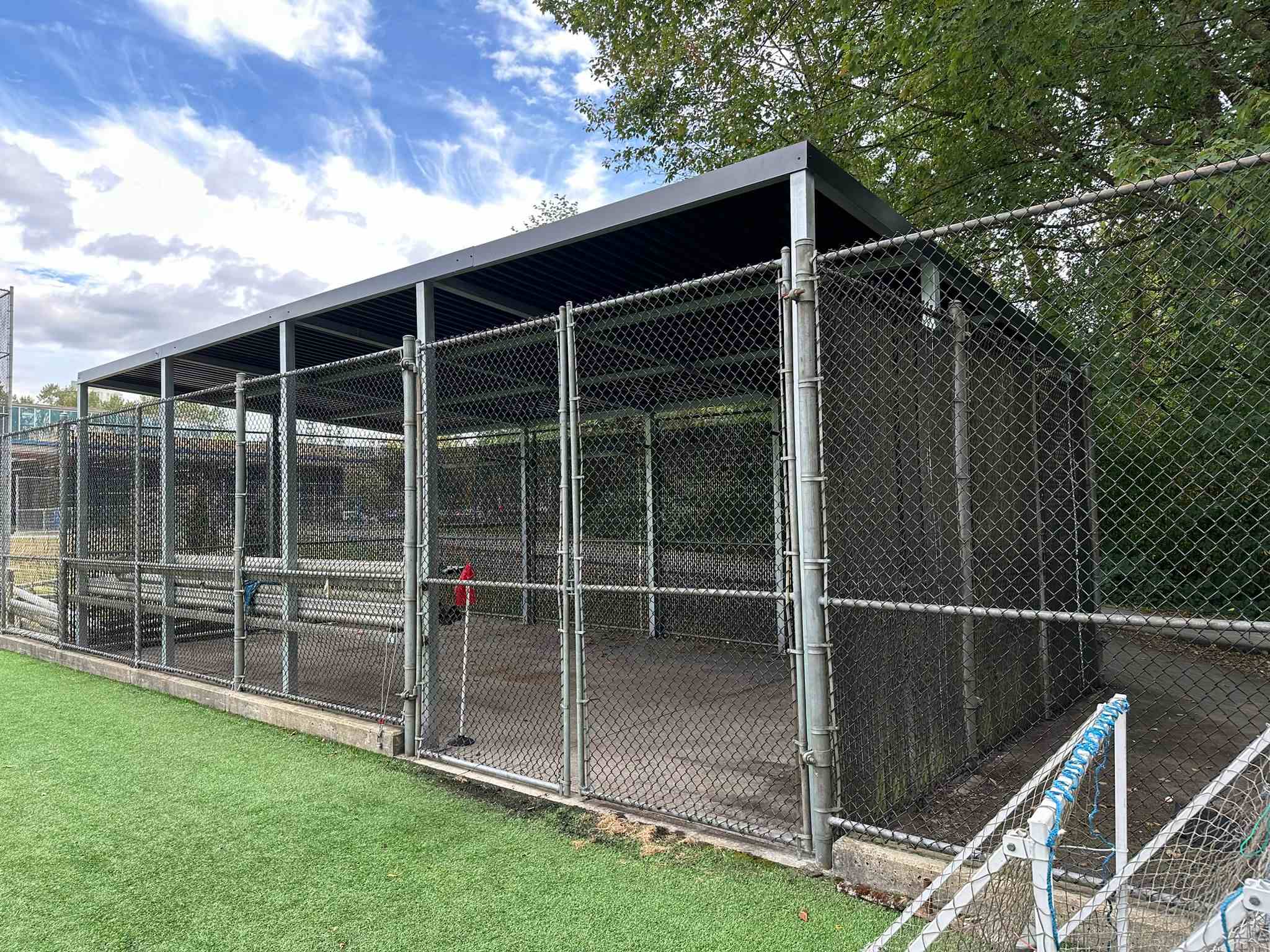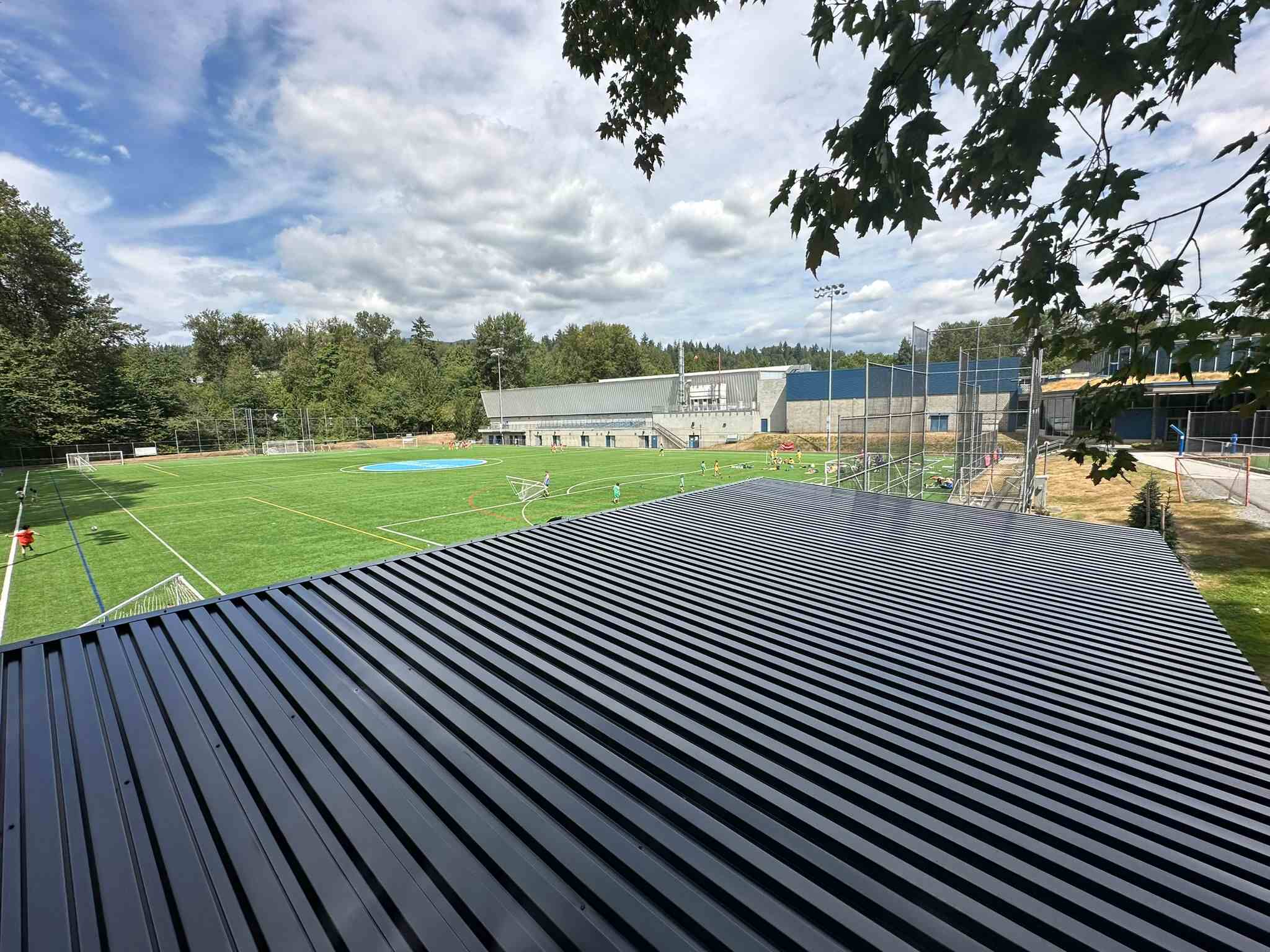 Trasolini field needed a more secure storage solution for their soccer equipment. We custom built this integrated 16 gauge metal roof onto the existing storage enclosure. The self-supported structure was built on new posts, and features a single sloped roof to direct rainwater away from the field.