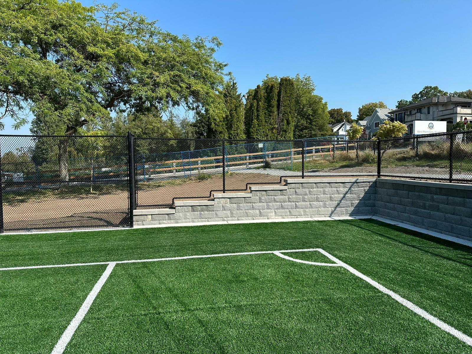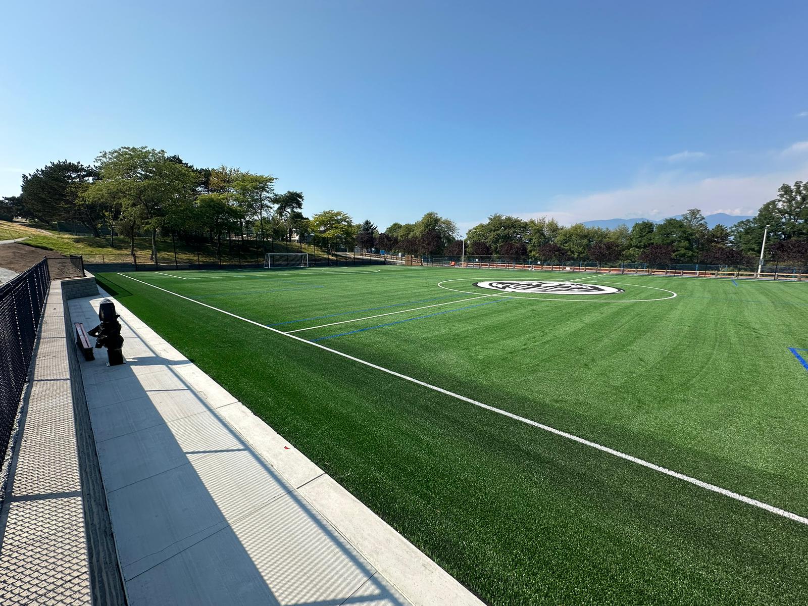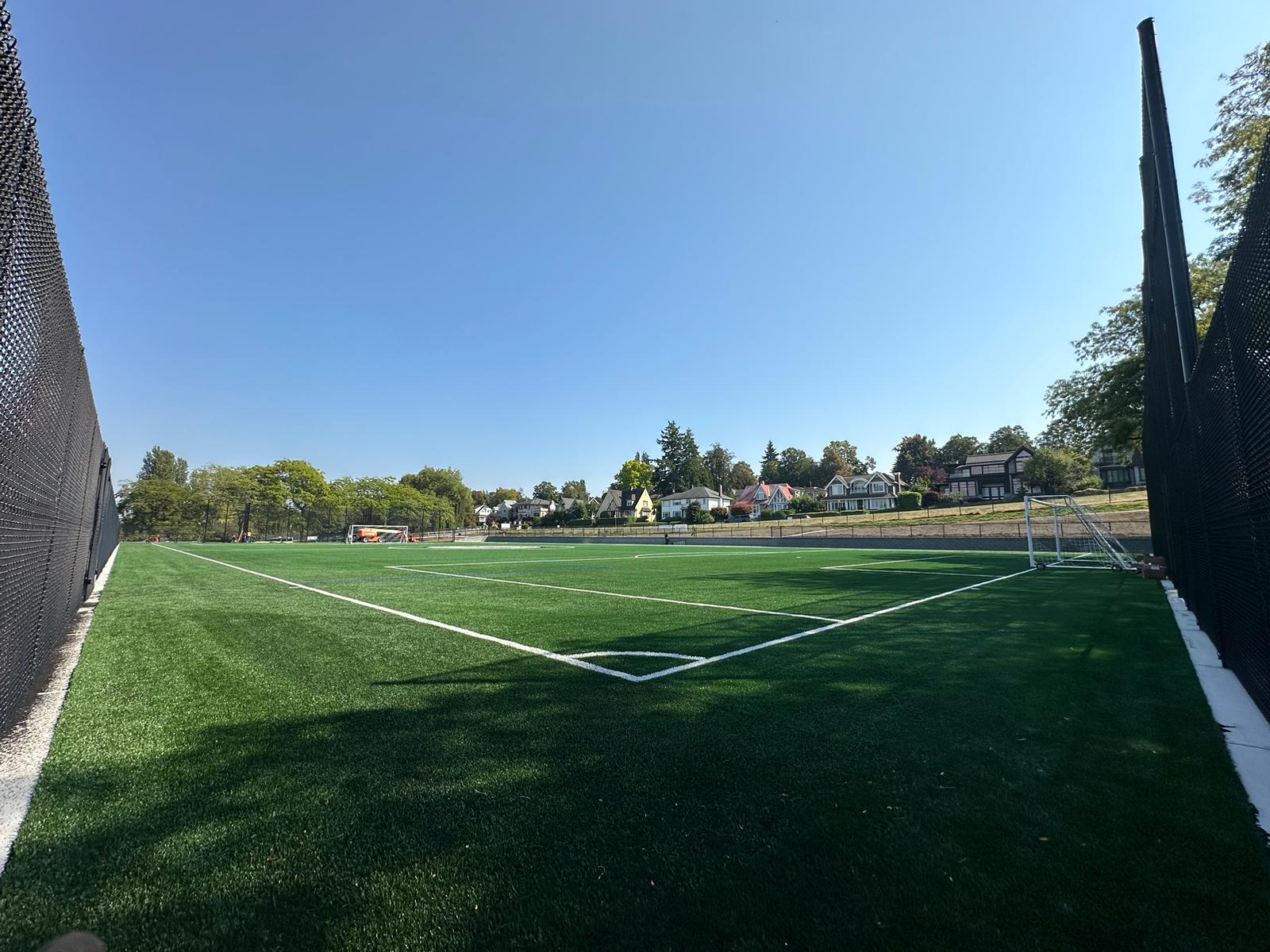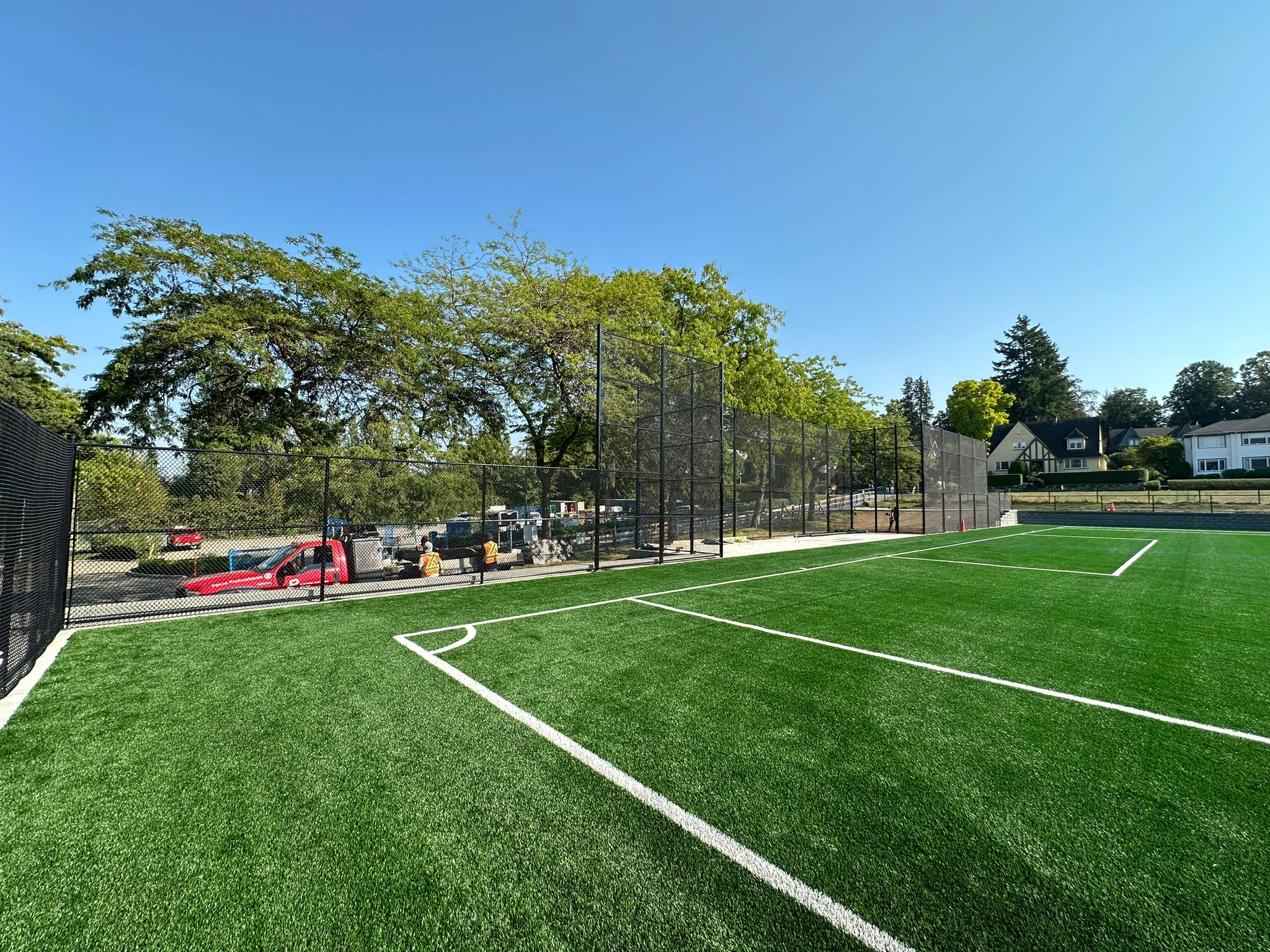 An absolute stunner of a park: a new field and running track for West Point Grey Academy! With Heatherbrae‘s management and Wilco providing the civil work, we installed brand new chain link fence around the entirety of the field’s perimeter. The mesh was vinyl-coated and the posts powder-coated, both in black.